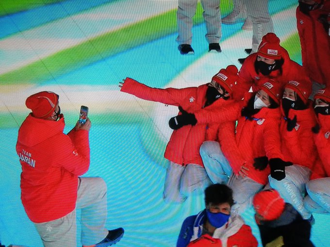 日本選手団が入場しました。フィギュアスケートの #坂本花織 選手 #りくりゅうペア の #木原龍一 選手 #三浦璃来 選手が記念撮影する姿が見えます