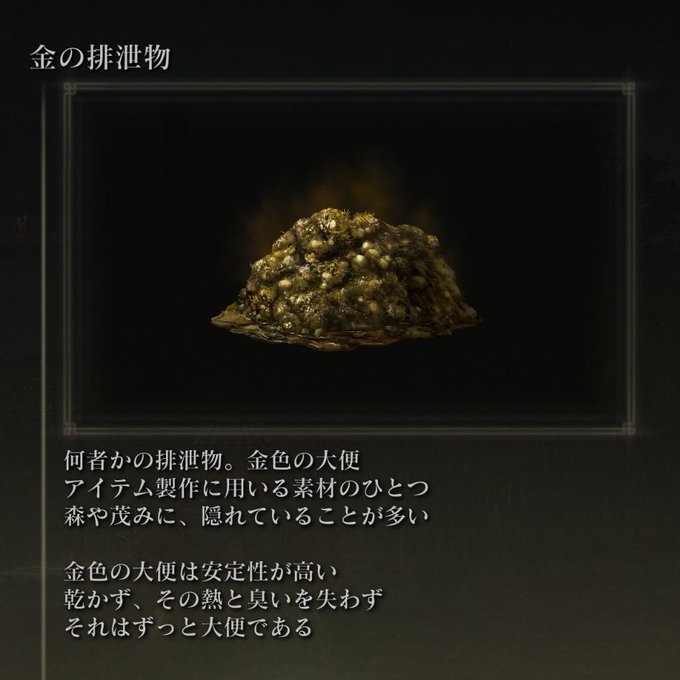 「安定性の高い金色の大便」「それはずっと大便である」どちらもエルデンリング以外では聞くことがなさそうだ #ELDENRING pic.twitter.com/H5wZsnXp2A