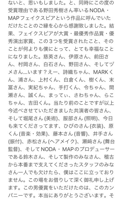 フェイクスピアに携わった方々のすべての名前を大切に誇らしげに挙げる姿や、マネさんとの素敵な絆、「自分の芝居は評価や賞からは縁遠いのではないか」「灯火のようなお芝居を」という言葉 もう胸がいっぱいです