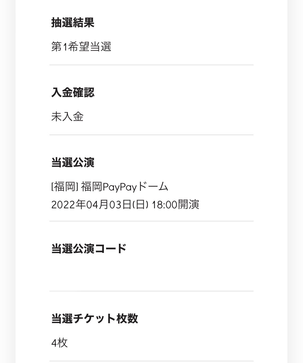 Twitter開いたらなんか当落のこと話してて、私メール来てない…やっぱそんなうまく行かないよね!今年も外れだよね!って言いながら一応念の為FC開いたら…