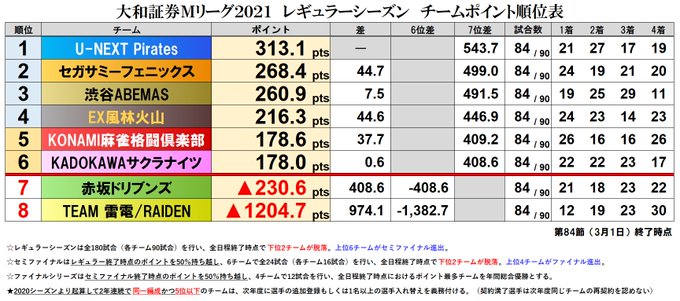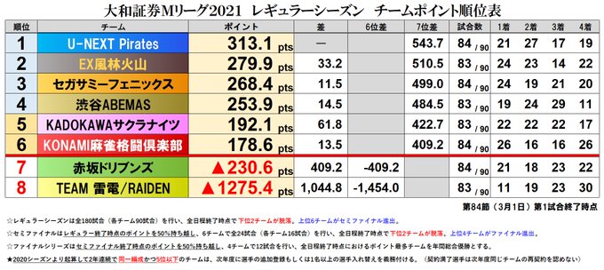 大和証券 #Mリーグ 2021【チーム成績順位表】