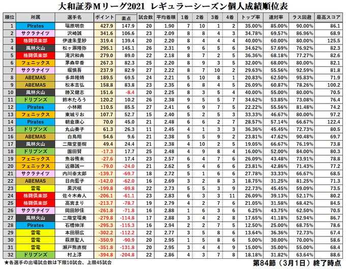 大和証券 #Mリーグ 2021【個人成績順位表】
