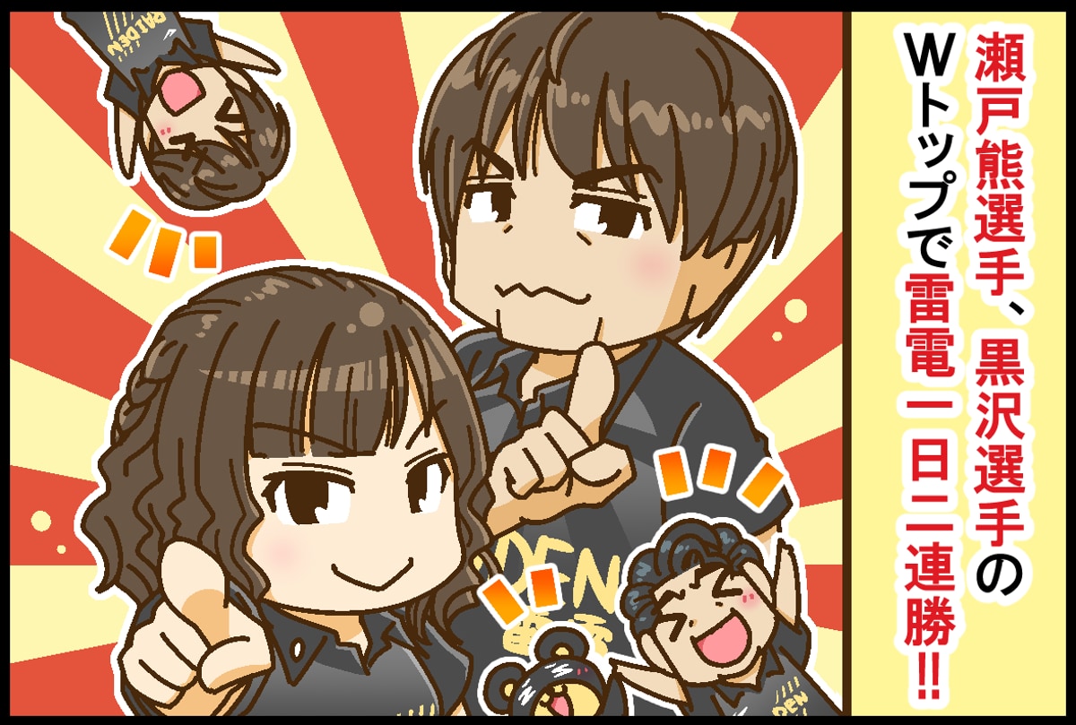 TEAM雷電、瀬戸熊直樹選手・黒沢咲選手のWトップで1日2連勝!! インタビューではもちろん おなじみのアレが…!?【 #Mリーグほぼ毎日4コマ 】 #藤島じゅん /VOL.261
