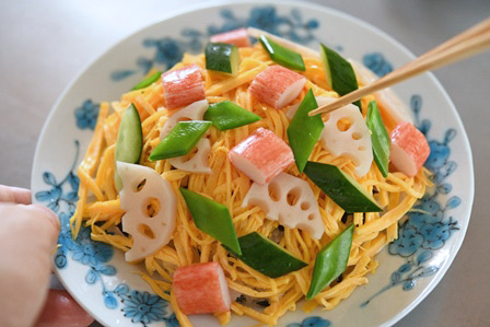 カニカマを使ったちらし寿司をアップしました。カニカマの他には、きゅうり、絹さや、あれば酢れんこんくらい。手ごろな具材でばっちり美味しく仕上がります。たっぷりの錦糸卵でぜひ。#ひな祭り #ちらし寿司