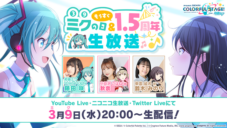 このあと20時より『プロジェクトセカイ ミクの日&もうすぐ1.5周年生放送』を生配信📺