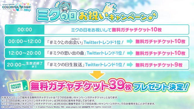 達成報酬の「無料ガチャチケット9枚」含めて、ミクの日お祝いキャンペーンの「無料ガチャチケット」は3月30日に配布を予定しております🎁