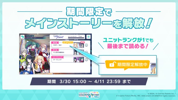 また、1.5周年の3/30(水)より期間限定で、メインストーリーが全て開放されます!この機会にプロセカのストーリーをたくさん楽しんで、報酬のクリスタルを獲得しましょう✨