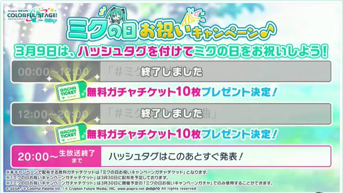 達成報酬の「無料ガチャチケット9枚」含めて、ミクの日お祝いキャンペーンの「無料ガチャチケット」は3月30日に配布を予定しております🎁