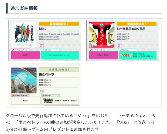 グローバル版に先行実装されていた、Anamanaguchiさんの「Miku」の追加が決定しました!