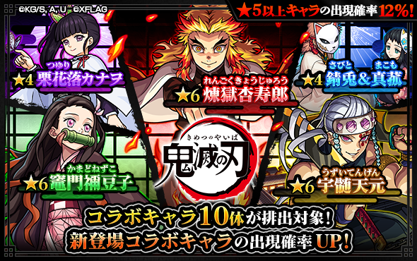 「煉󠄁獄杏寿郎」「宇髄天元」「竈門禰󠄀豆子」「栗花落カナヲ」「錆兎&真菰」の他、コラボキャラ10体が排出対象❗️