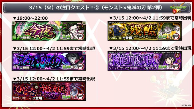 明日(3/15)19:00~22:00で、コラボクエスト「今夜」(★5 堕姫)が初出現!