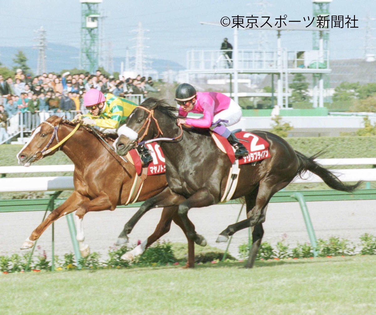 GⅡながら歴史的な一戦でした。動いたマヤノトップガンにナリタブライアンが呼応。馬体が並んだ残り3Fから始まった年度代表馬2頭の壮絶な一騎撃ち。