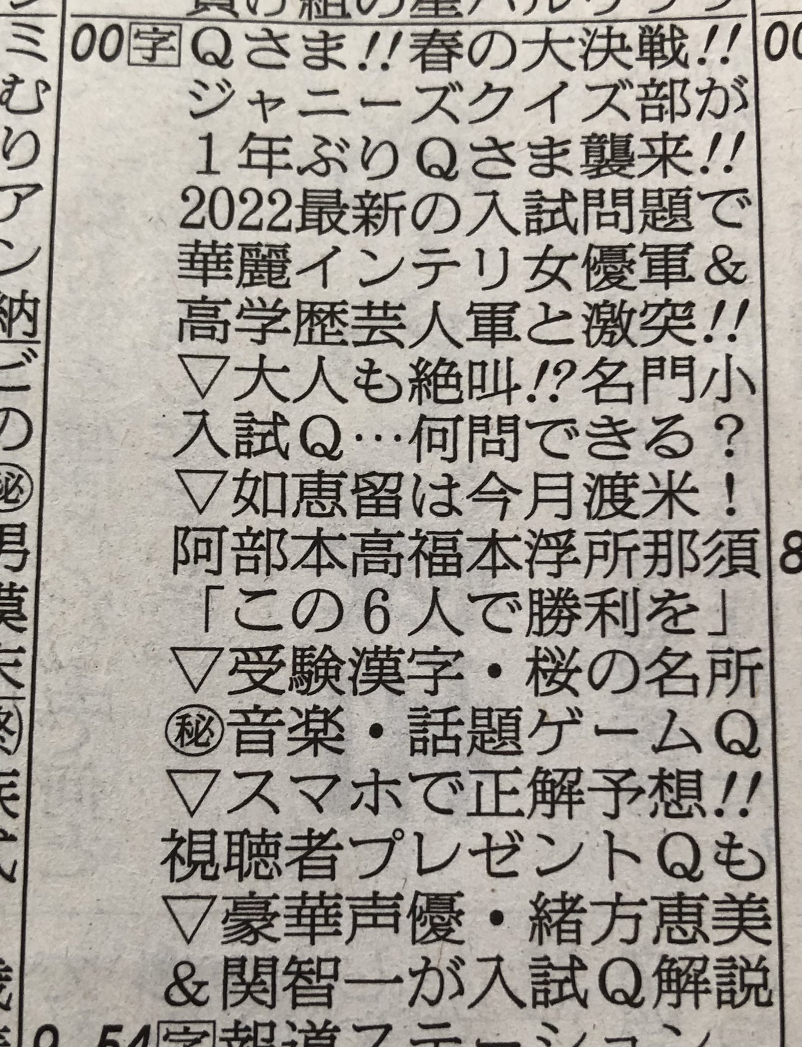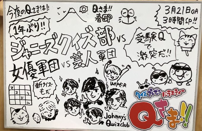 テレ朝にて今夜7時から #Qさま 春の3時間SPです。1年ぶりに #ジャニーズクイズ部 がQさま参戦で、芸人軍と女優軍と三つ巴頭脳バトル!