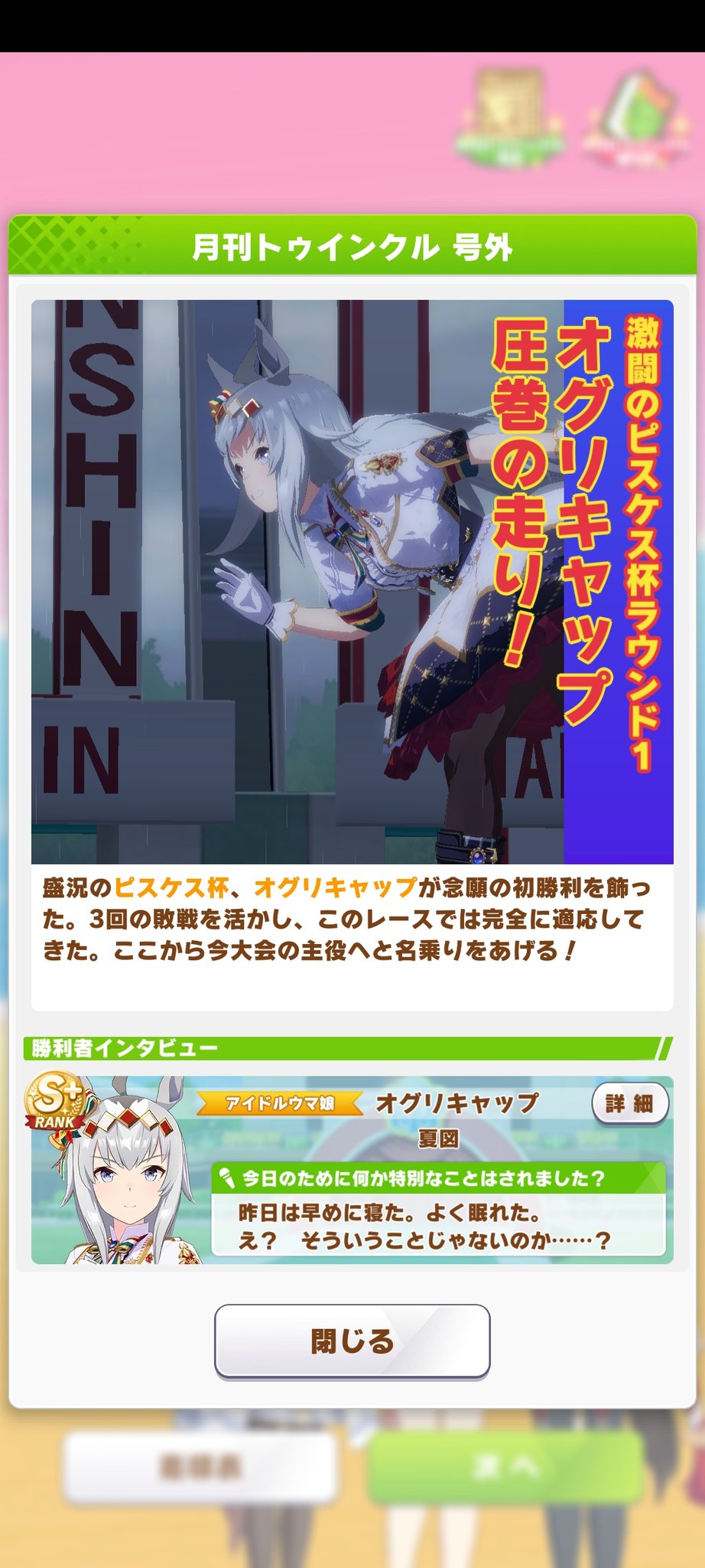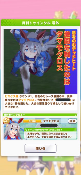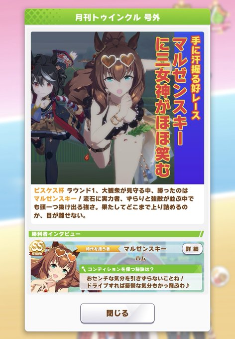 こんにちは♪ピスケス杯初日はチョベグー∩'ー`∩通過できました!思ってた以上にマルゼンが活躍してくれました!スキル表示されないのはバグですかね?それと号外記事が地味嬉しい😆