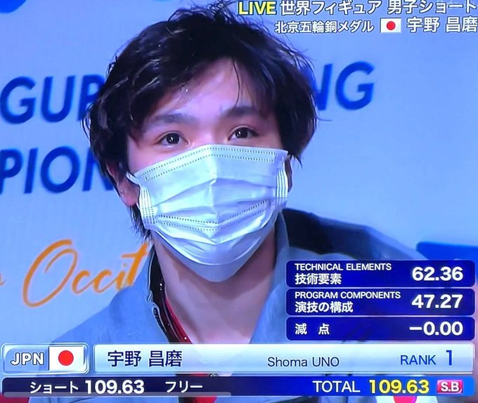 宇野昌磨選手、オリンピックに続き、SPでまたまた自己ベスト更新、そしてトップです❗️👏👏👏