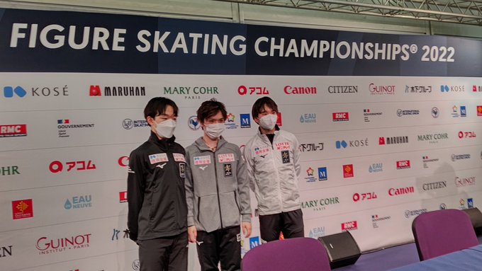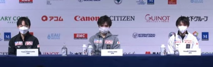 SPトップ3の会見。 #友野一希 選手は海外メディアから代替出場した回数を聞かれ、「これで5回目」と返答。代打での勝負強さに、ついに世界が注目し始めました。 #世界フィギュア