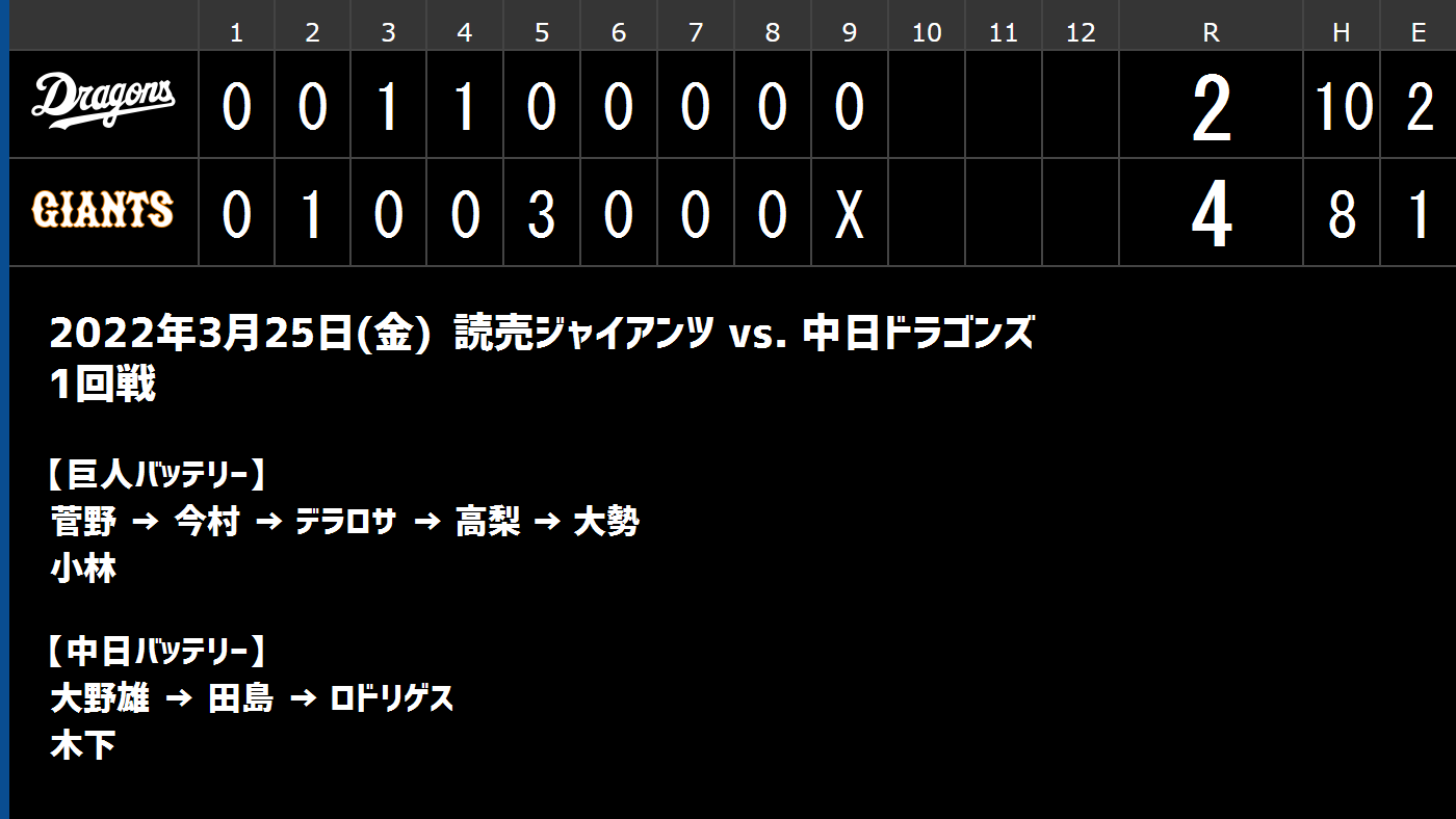 3月25日(金) セ・リーグ開幕戦「巨人vs.中日」【全打席結果速報】 立浪ドラゴンズ初陣!巨人・菅野智之vs.中日・大野雄大!!! - ドラ要素@のもとけ dnomotoke.com/archives/20220… #dragons #中日ドラゴンズ