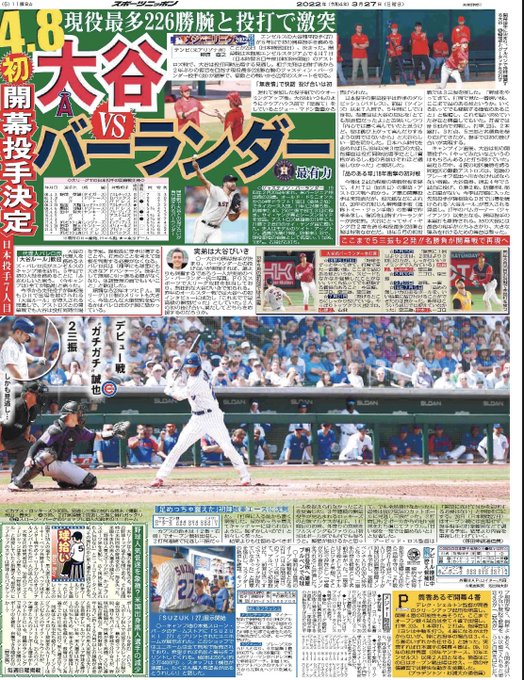 遅れましたが日本時間本日3月27日付 #スポニチ(東京最終版)MLB面は丸々1枚使って #エンゼルス #大谷翔平 選手や#カブス #鈴木誠也 選手を報じています。是非手に取ってご覧頂ければ幸いです🙇♂️ pic.twitter.com/EdND2KUjSV
