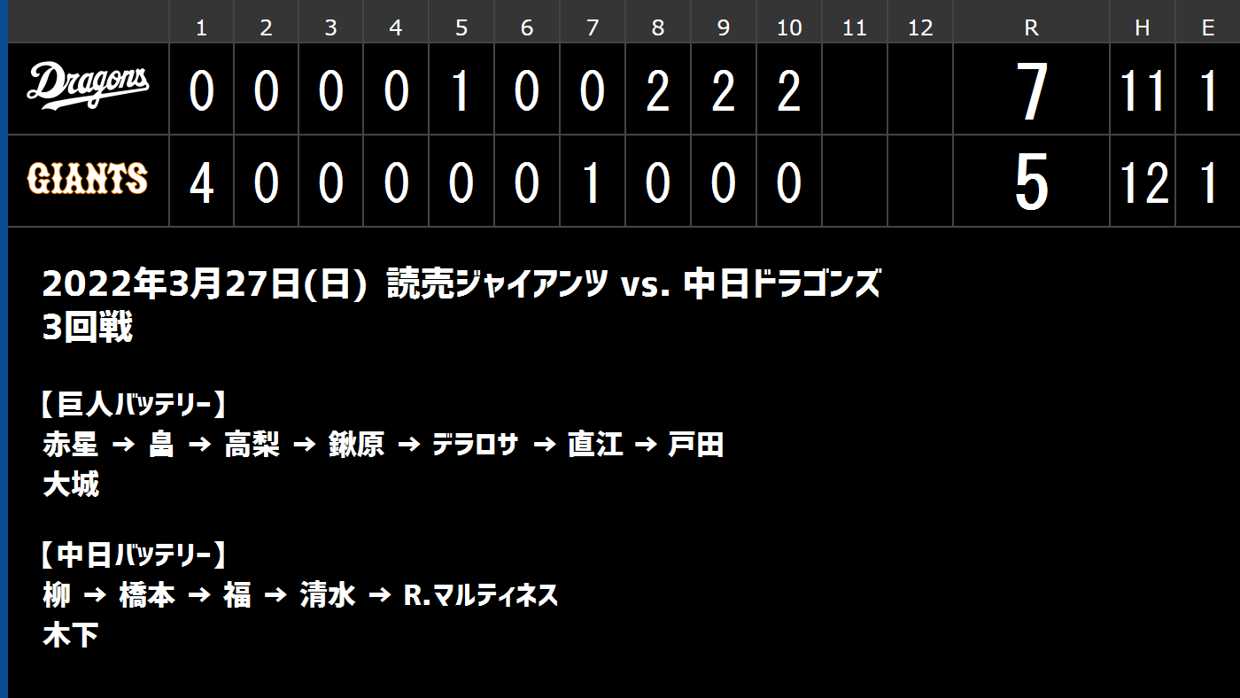 3月27日(日) セ・リーグ公式戦「巨人vs.中日」【試合結果、打席結果】 中日、7-5で勝利!!! 立浪監督、初勝利!中日ドラゴンズの今季初勝利は劇的な大逆転勝ち!!! - ドラ要素@のもとけ dnomotoke.com/archives/20220… #dragons #中日ドラゴンズ