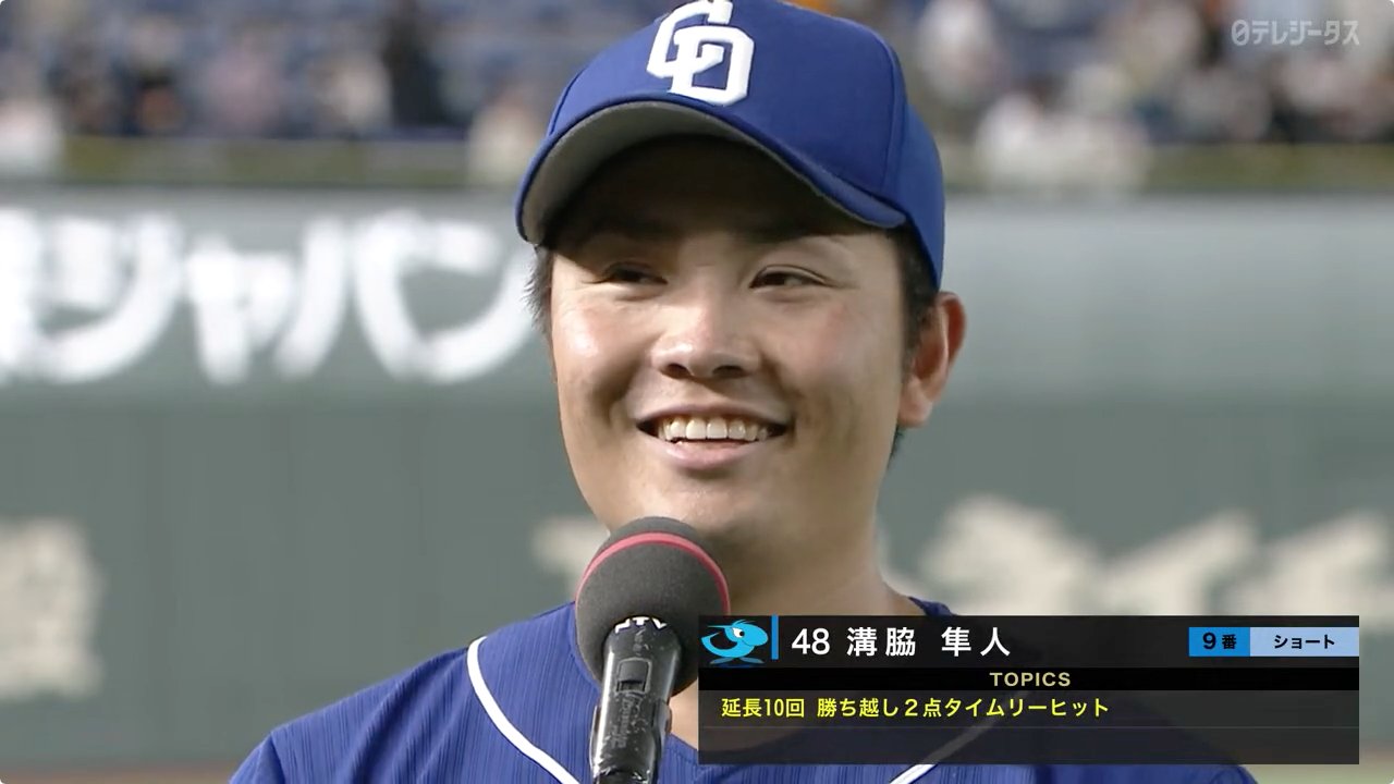 溝脇選手のヒーローインタビューかっこよすぎた😭💙推しを見つけると楽しいって言われたけどこんな試合を生でみたら推してしまう🐲🐉溝脇選手のインタビューをききながら、うわーーはやく、勝つための努力!!な曲、「蒼の鼓動」絶対きいてほしい!って思った!!!4/12はよーーー!!#dragons pic.twitter.com/tlDeZ25cs7