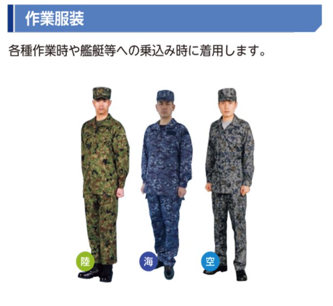 #自衛隊 には陸・海・空でそれぞれの作業服があるんやで!
