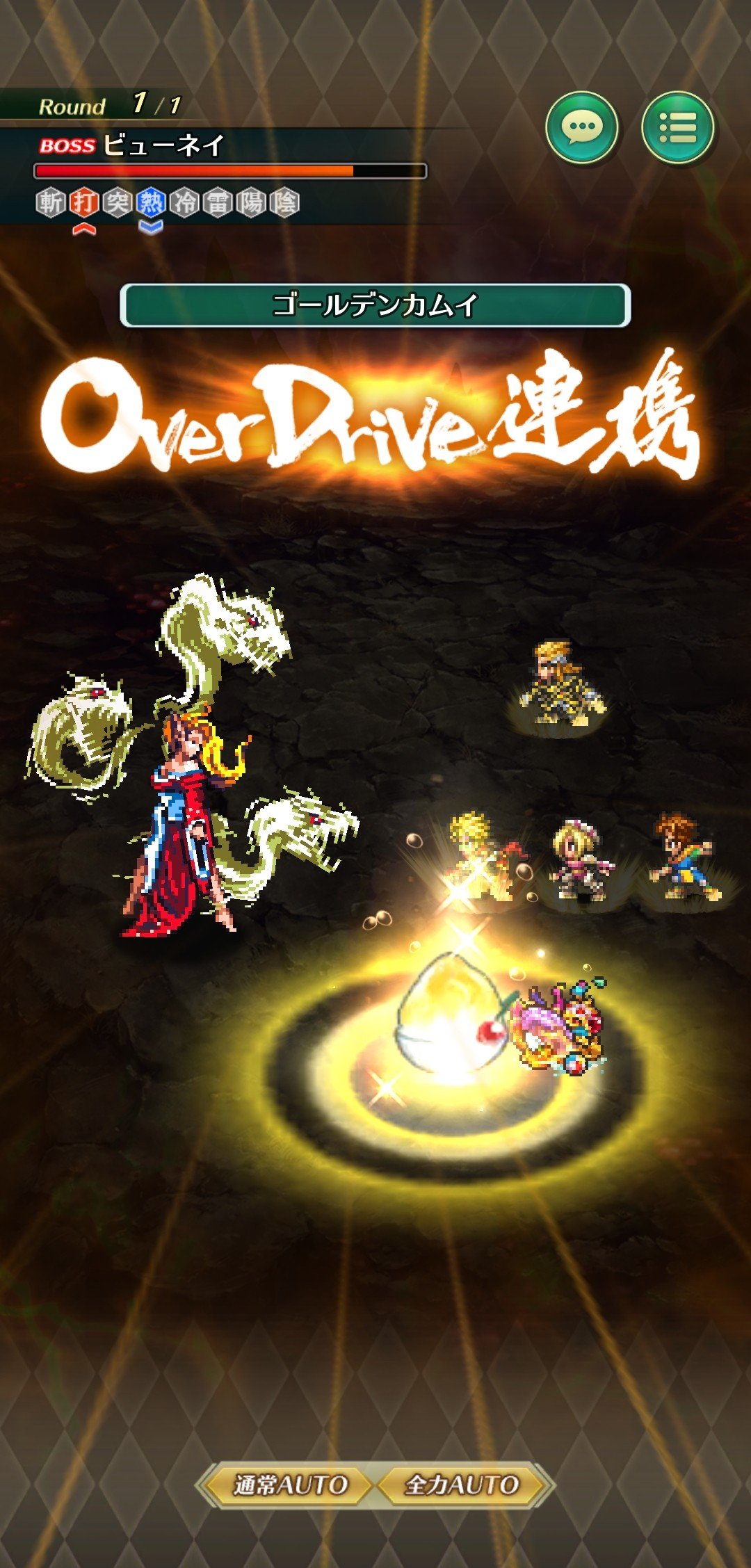 斬属性横一列間接攻撃後、味方生存者全体に「防御態勢(術)(効果2ターン)」を付与する攻撃技【鋼覇一閃】を閃く!