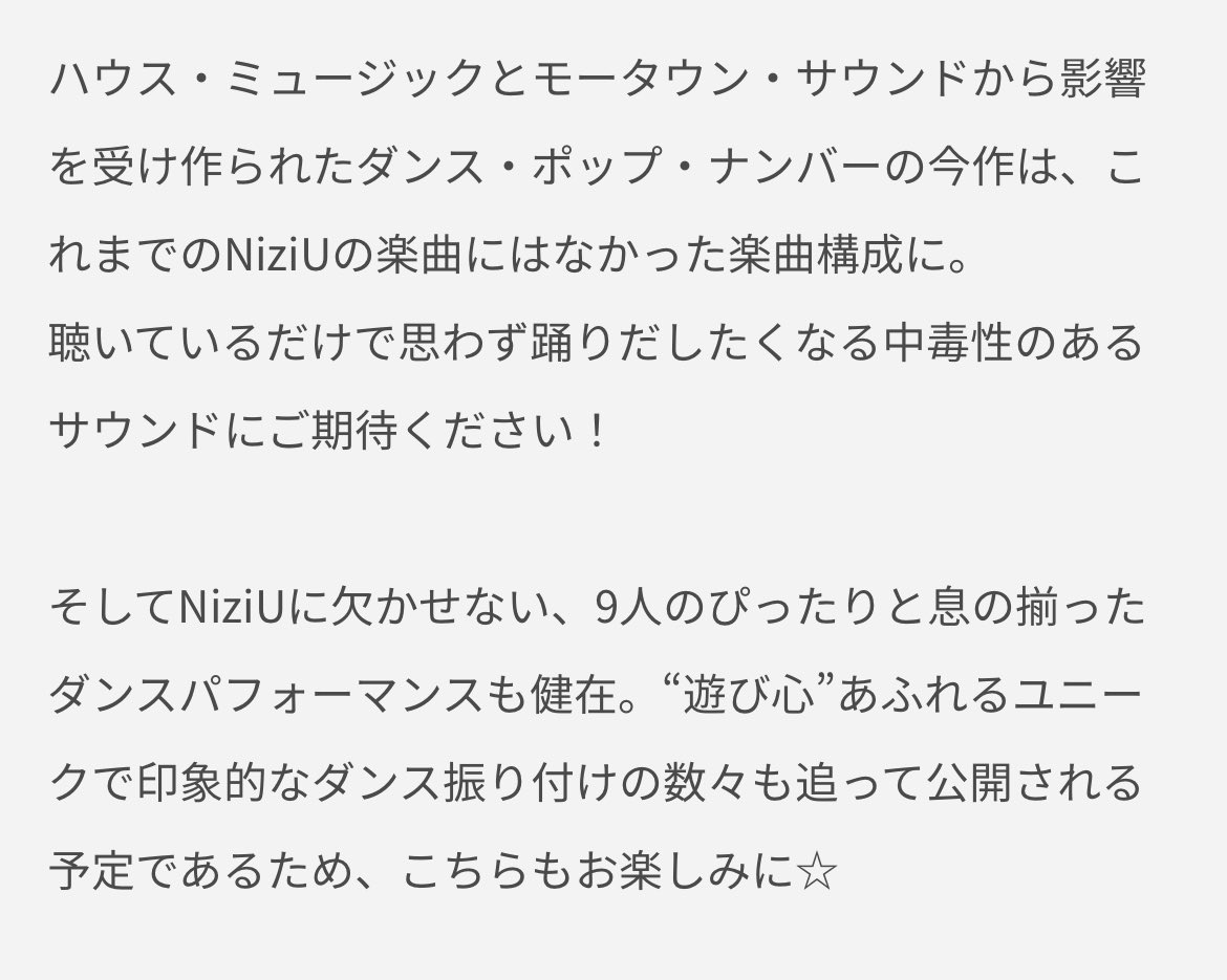 “そしてNiziUに欠かせない、9人のぴったりと息の揃ったダンスパフォーマンスも健在。“遊び心”あふれるユニークで印象的なダンス振り付けの数々も追って公開される予定であるため、こちらもお楽しみに☆”