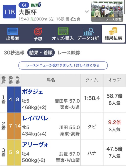 【大阪杯】ポタジェ(8番人気)が大金星。重賞初制覇がG1勝利となりました。2着にレイパパレ。3着にはアリーヴォが入りました。勝ったポタジェは父ディープインパクト、母はジンジャーパンチ。ルージュバックの半弟という血統です。#大阪杯 #ポタジェ #吉田隼人 pic.twitter.com/vjyYqRM0vT