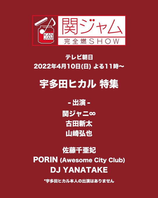 来週日曜日4/10 23:00~の #関ジャム @kanjam_tvasahiは#宇多田ヒカルを大特集!😍