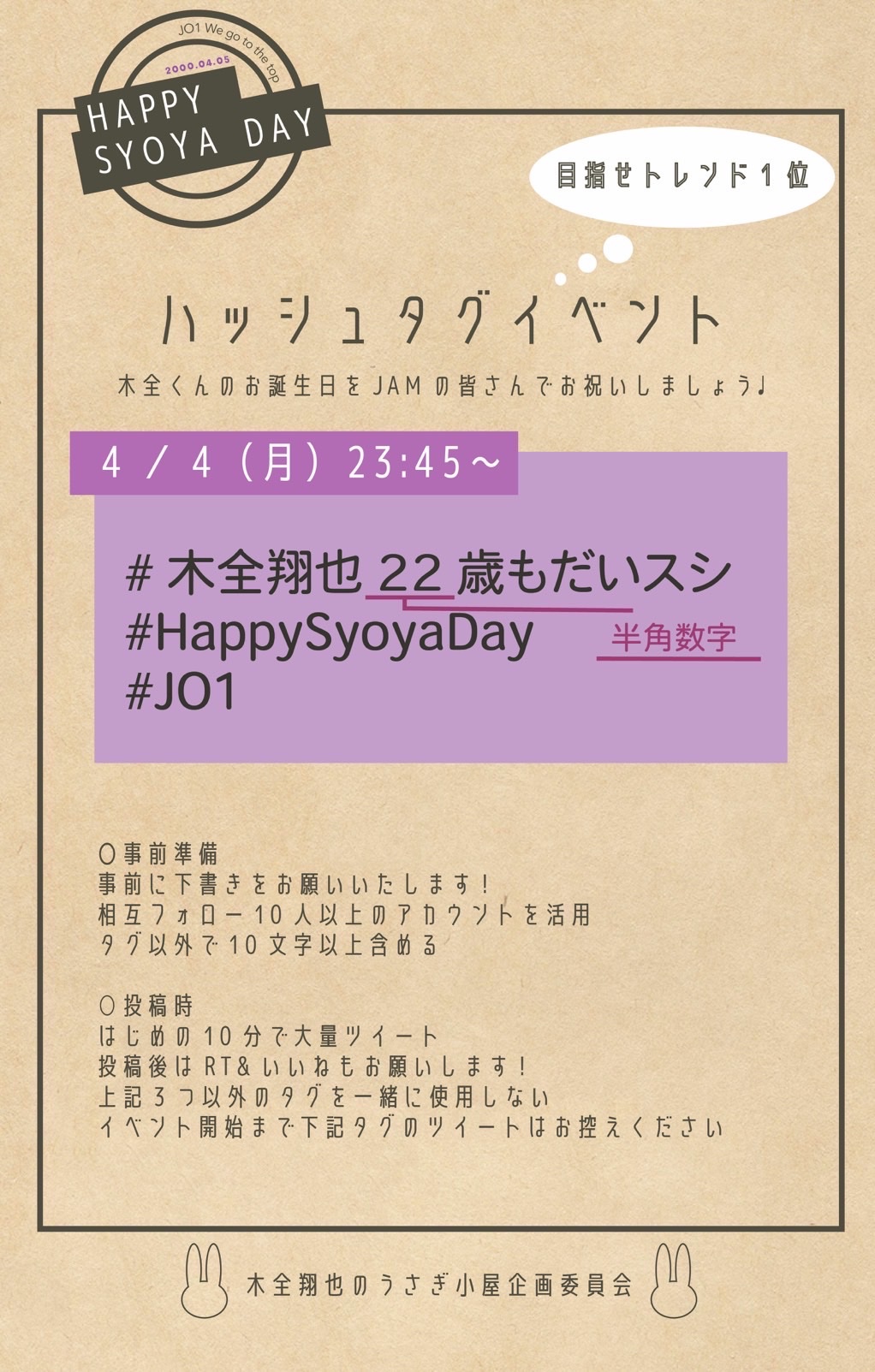 22歳を迎える木全翔也くんのお誕生日を記念して、タグイベントを開催いたします🐰📣