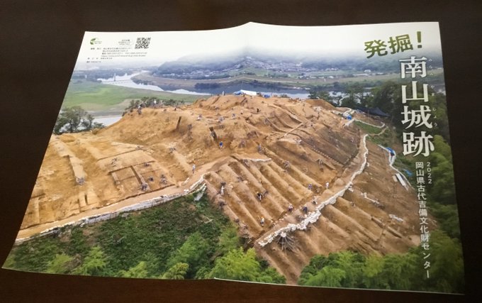 岡山県古代吉備文化財センターから、南山城跡のパンフレットが刊行されました。表紙と裏表紙をまたいで全面印刷された全景写真は大迫力ですね。。。在りし日の優れた城郭構造や出土遺物の内容を、豊富な写真・図版で一目で知ることができます。城の成立背景・使用期間にも言及されてます。 #城の日 pic.twitter.com/ZxFUq8JZ3K
