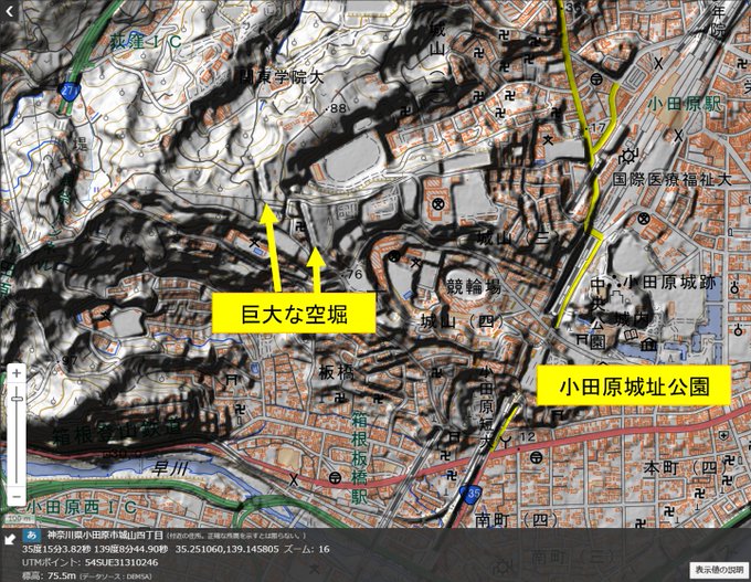#小田原城 は城址公園や総延長約9キロメートルにも及ぶ #総構 (そうがまえ)が有名ですが、#戦国 時代に #小田原北条氏 が作った巨大な空堀が城址公園西側の城山地区に。