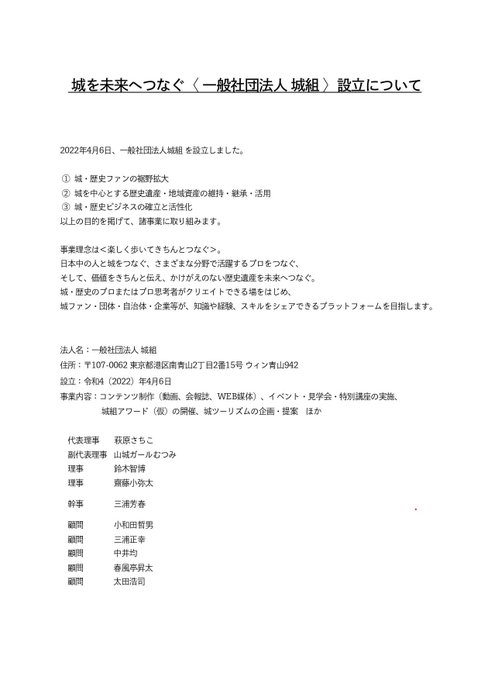 本日、2022年4月6日(城の日)に一般社団法人城組を設立しました。