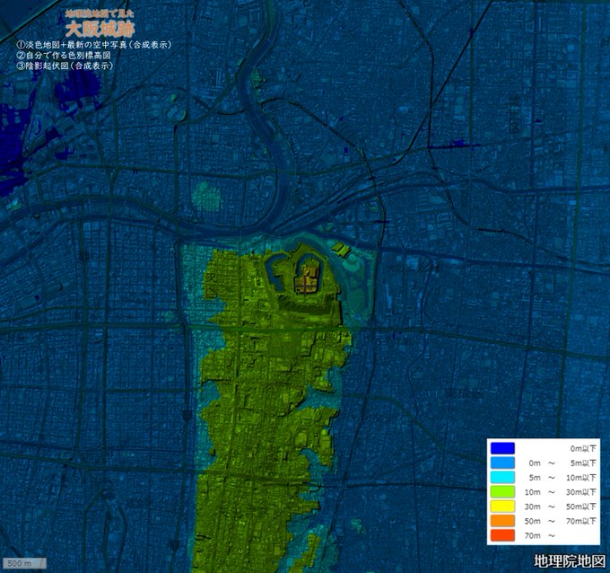 「なぜそこに城がつくられたのか」は、地理院地図の色別標高図と陰影起伏図を使うとうまく説明できる場合が多いです。江戸城・名古屋城・大阪城・福岡城をご覧ください。台地や丘陵部の縁にあることが分かります。 #城の日 pic.twitter.com/HGc1850ubU