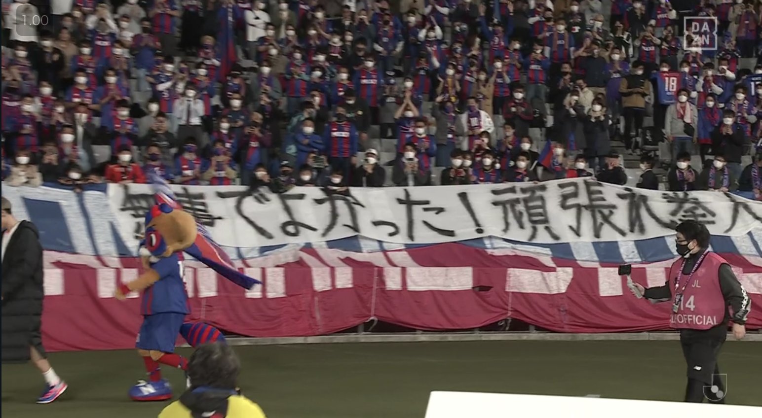 試合後、#FC東京 のファン・サポーターのもとへ挨拶に向かい、スタンドからは「無事でよかった!頑張れ拳人!」の横断幕が掲出された。 pic.twitter.com/7K2XiLM8FI