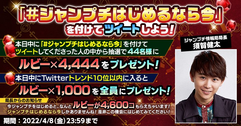 「#ジャンプチはじめるなら今」を付けてツイートしてくださった人の中から44名様に「ルビー×4,444」をプレゼント😍✨