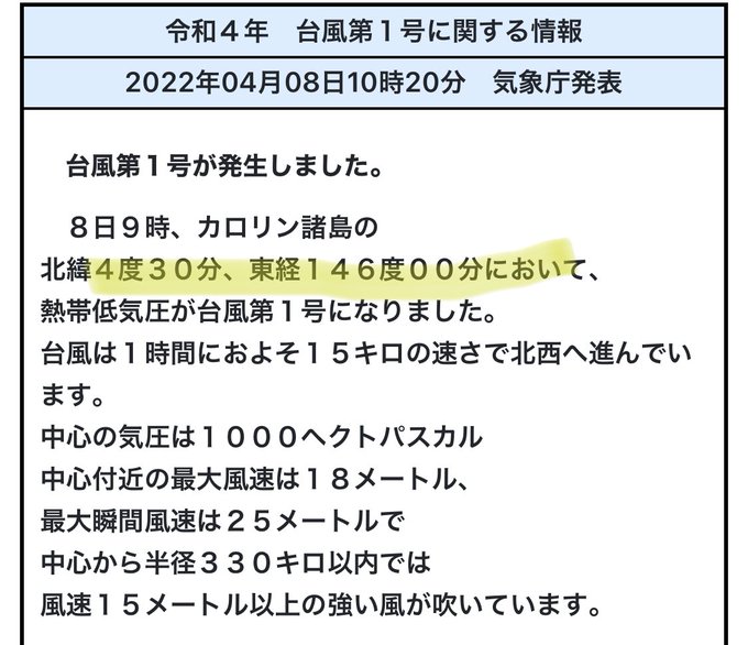 今日、台風1号が発生しましたが、発生場所が北緯4度30分。