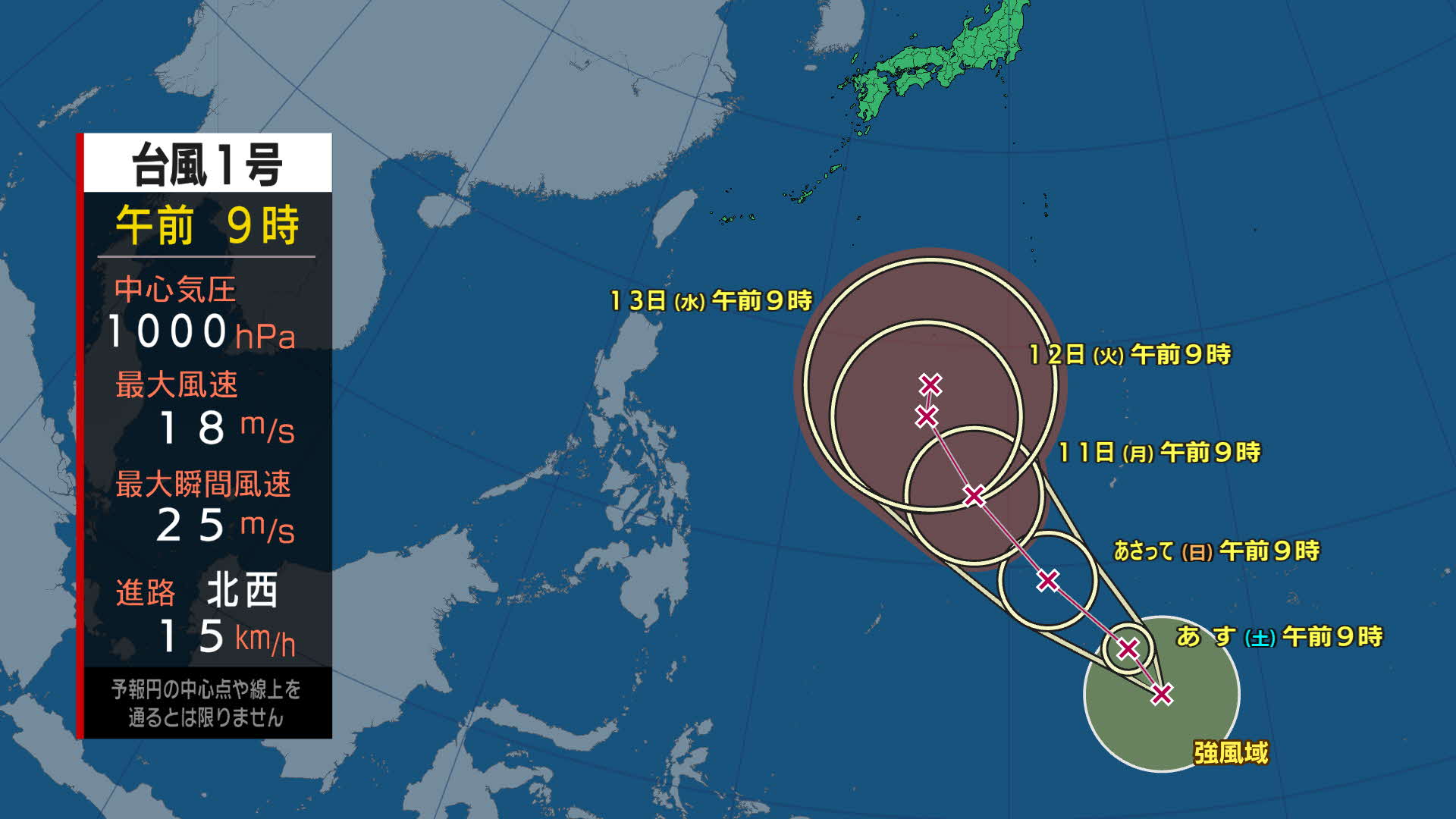 台風は1時間におよそ15キロの速さで北西へ進んでいます。