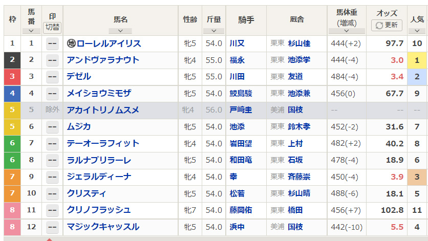 アカイトリノムスメ競走除外で15:34時点単勝オッズ、アンドヴァラナウトが3.0倍の1番人気となります。