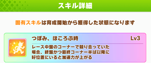 ・固有は終盤の最終コーナー半ば以降に発動する加速スキル
