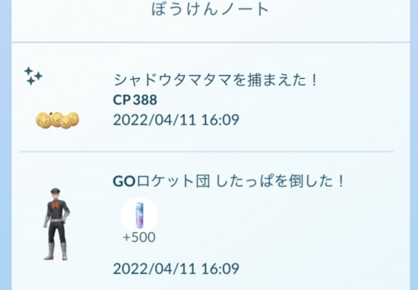 2022/4/11(月)18:31頃、くさグループのGOロケット団したっぱ男性「おれ達にツタのように絡むとロクなことにならないぜ!」から、色違いのシャドウタマタマの出現が確認されています👿✨