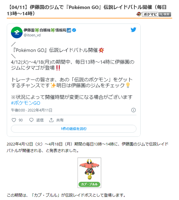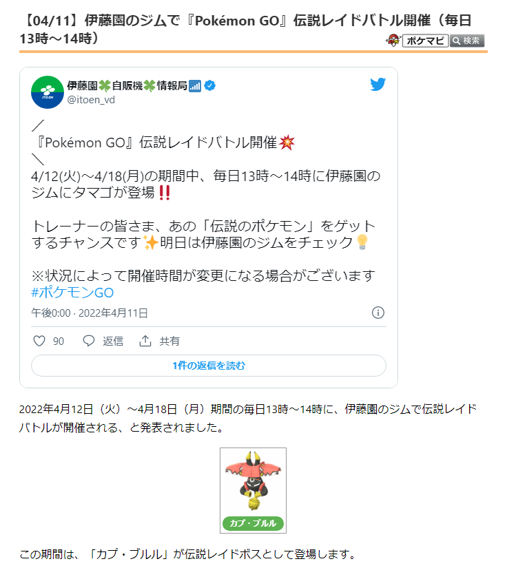 4月12日(火)~4月18日(月)の春イベントの期間中に、カプ・ブルルのレイドが伊藤園のジムであるようです。