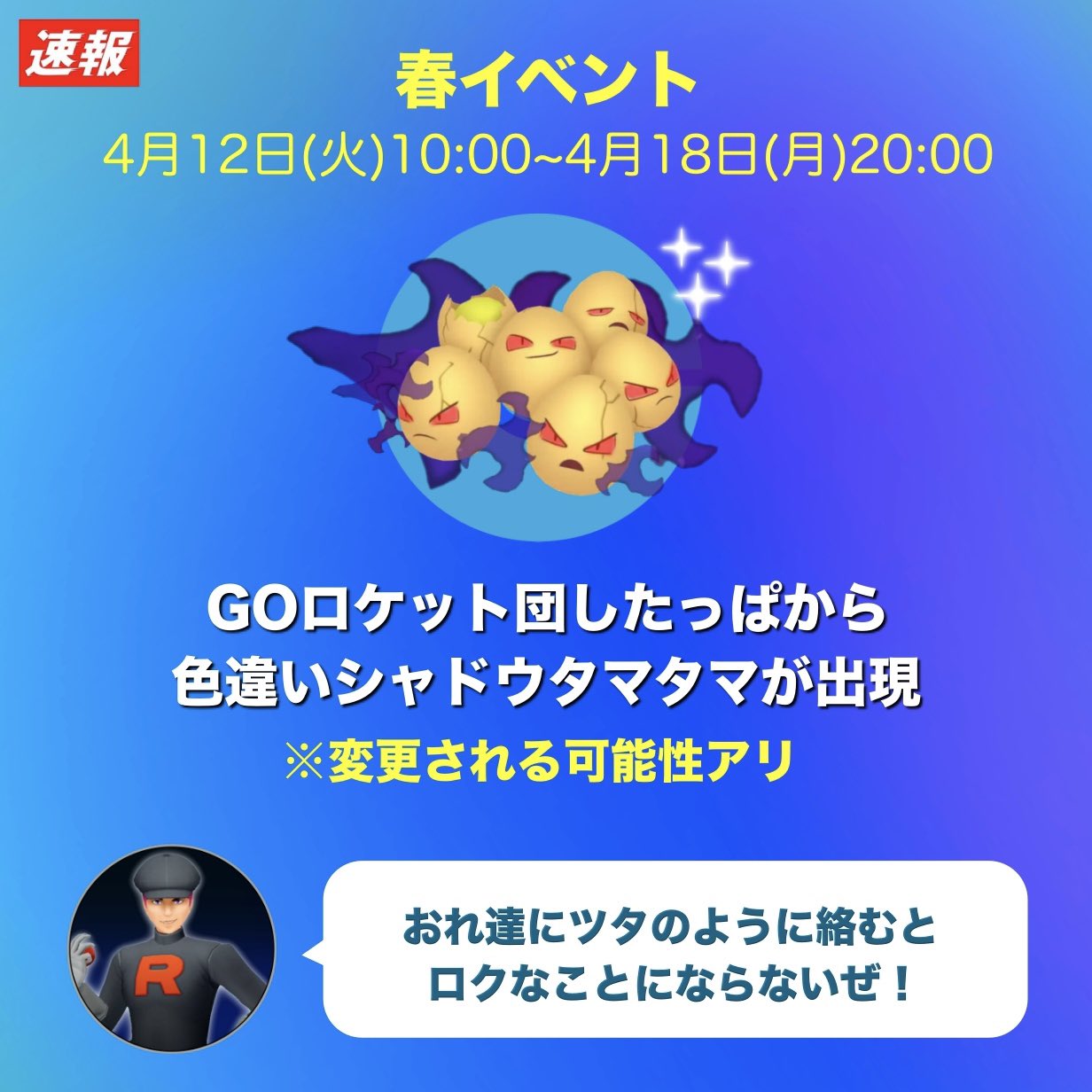 まもなく開催される春イベントでは、男性したっぱから色違いのシャドウタマタマが狙えるようです!※すでに出現報告アリ