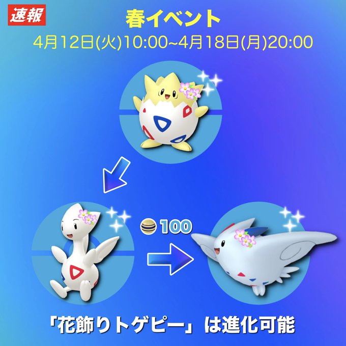 トレーナーの皆さん、花飾りをつけた「トゲピー」は花飾りをつけた「トゲチック」、花飾りをつけた「トゲキッス」に進化させることができます。(返信に続く)#ポケモンGO