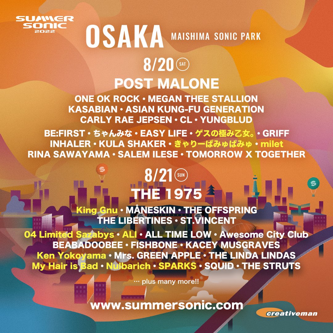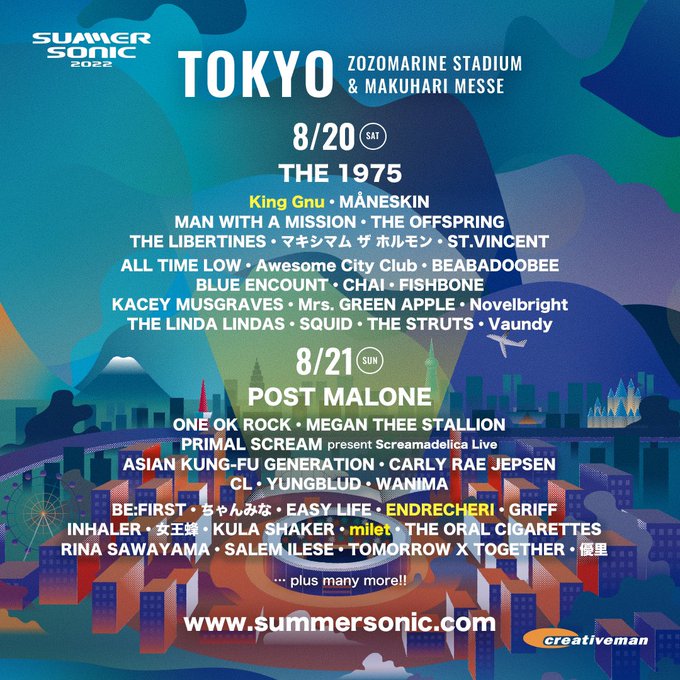 『SUMMER SONIC 2022』追加アーティストにKing Gnu、milet、ENDRECHERI、ゲスの極み乙女。など11組が決定 #サマソニ #summersonic musicman.co.jp/artist/468316