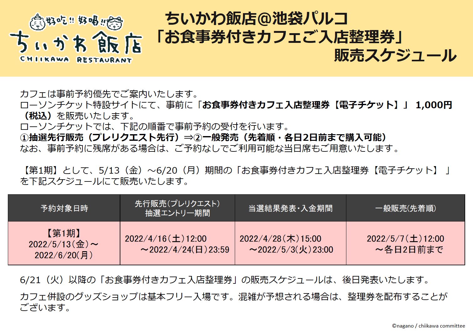 ローチケ特設サイトにて、事前に「お食事券付きカフェ入店整理券」 1,000円(税込)を販売。第1期として【5/13(金)~6/20(月)】のカフェ入店整理券を下記日程にて、販売いたします。
