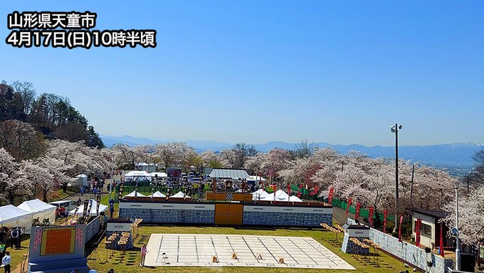 人間将棋の対局が行われる山形県天童市でも、満開の桜が青空に映える絶好の天気となっています。