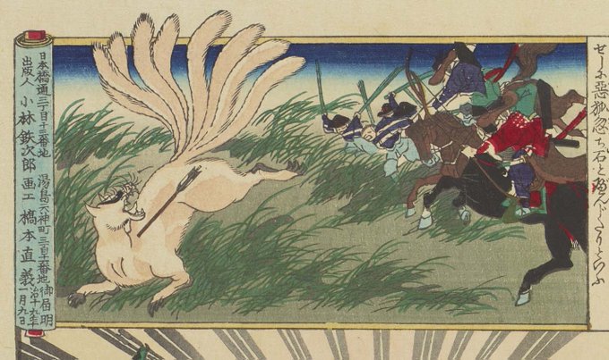 NHK大河ドラマ #鎌倉殿の13人 にちなんだ浮世絵をご紹介。上総広常には九尾の狐を退治したという伝説が。玉藻前という美女に化けて鳥羽上皇をたぶらかした九尾の狐。上総広常は千葉常胤と三浦義明と協力し、下野国の那須で九尾の狐を退治しました。楊洲周延「東絵昼夜競」より。※現在展示していません pic.twitter.com/aW8mM2KAP0