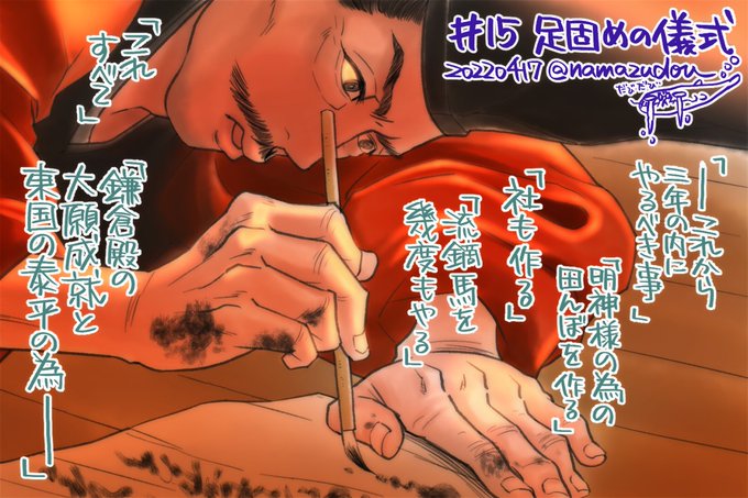 上総介の鎧から出てきた書きつけが…"これから3年のうちにやるべきこと 明神様のための田んぼを作る 社も作る 流鏑馬を幾度もやる これ全て鎌倉殿の大願成就と東国の太平のため"一所懸命覚えた字で、武衛のためにと精一杯考えたことを、敢えて鎧の内側に…戦場でも肌身離さぬように…
