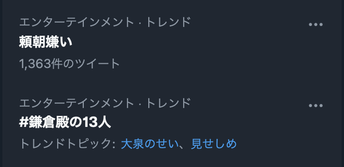 現在のトレンドがこんなことに。これだけ嫌われるというのは、それだけ役者・大泉洋の演技が凄いことの裏返しでもあり。さすがは長年騙されてまた騙されての人生を歩んできた男、疑心暗鬼の塊である頼朝を演じるのにこれ以上のキャスティングがあろうか。 #鎌倉殿の13人 #鎌倉殿どうでしょう pic.twitter.com/mUCOZV75rD